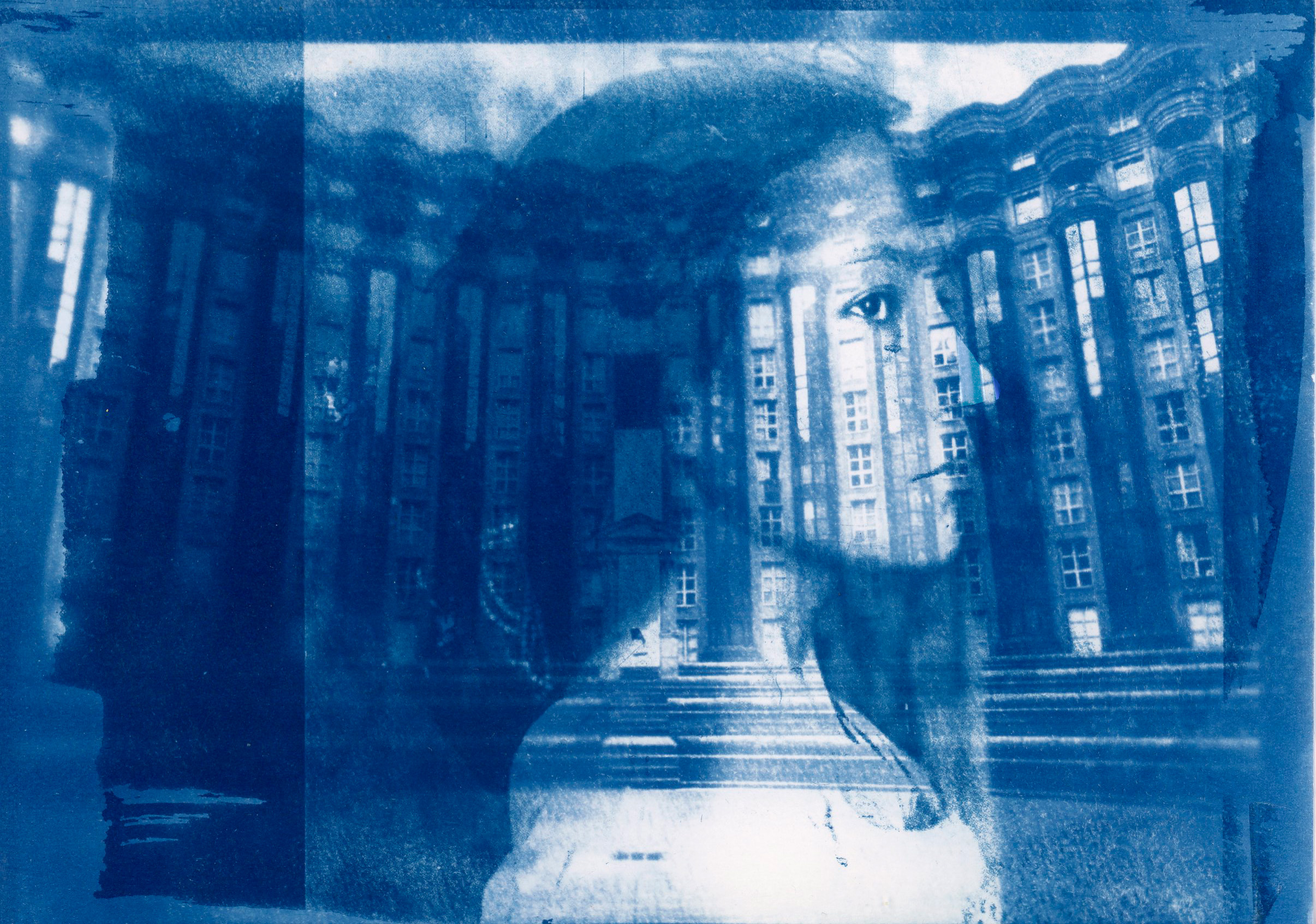 À partir d’un mélange de deux produits chimiques : le citrate d’ammonium ferrique et le ferricyanure de potassium, les participant·es expérimentent le pouvoir de la chimie, qui rend photosensible presque tout support sous l’action des rayons UV. Le procédé permet de réaliser un tirage à partir d’un négatif photographique ou d’éléments naturels (photogramme). Sous l’effet de la lumière, les sels ferriques deviennent ferreux et révèlent des nuances uniques de bleu de Prusse ou de bleu cyan, après exposition et rinçage à l’eau claire.